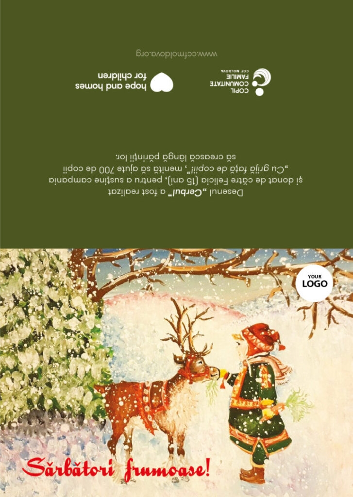 Noi ne ocupăm de pregătirea felicitărilor de Crăciun, fiecare dintre ele poartă pictura realizată de un copil.